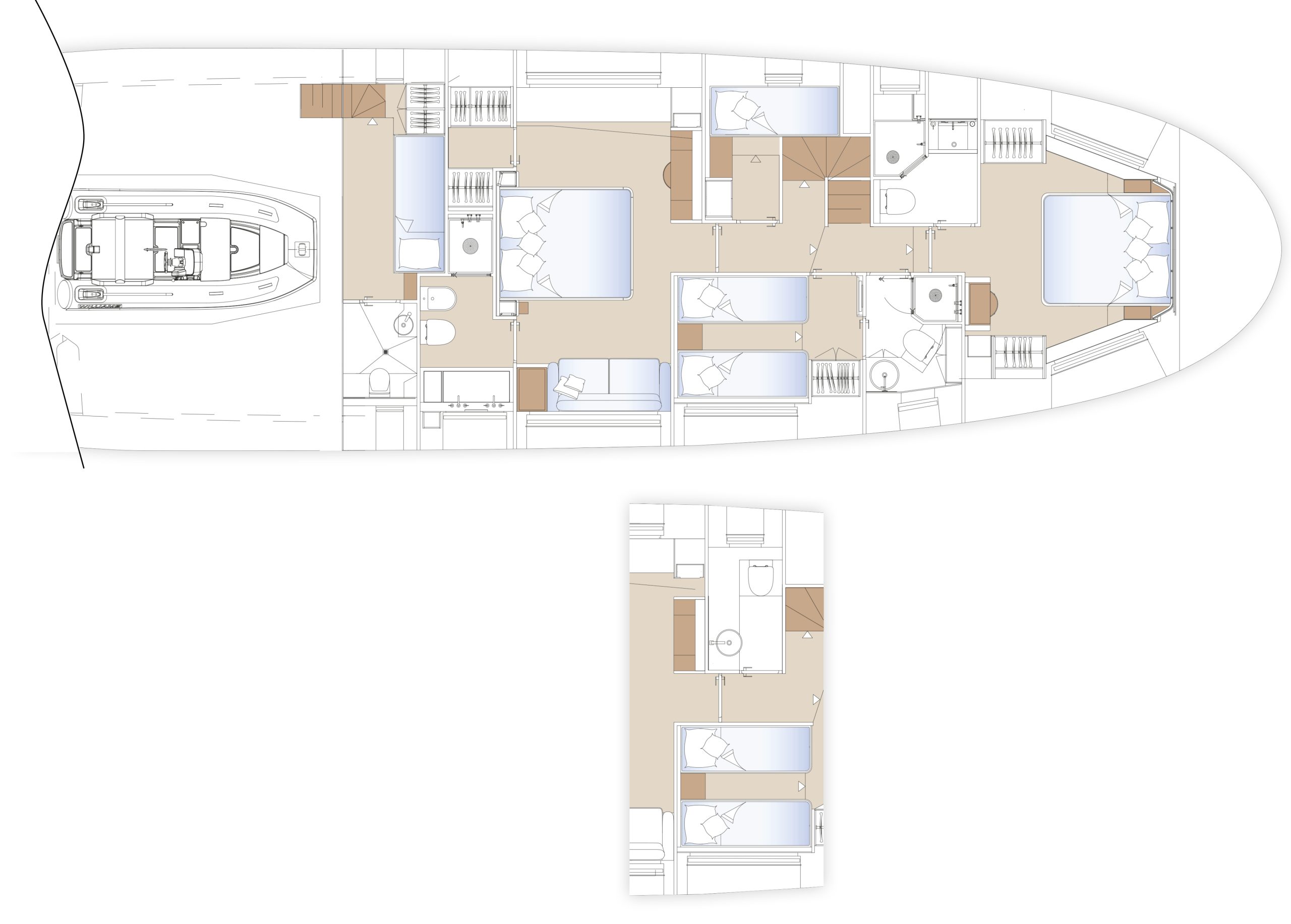 Il fly si estende per oltre 40 metri quadrati e offre tre aree di soggiorno. A poppa un vasto